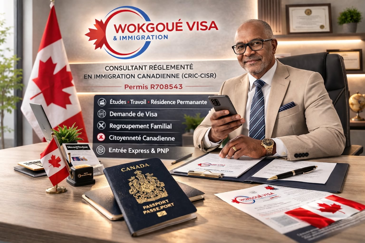 Fondateur de Wokgoué Visa & Immigration Services Inc., j’élabore des stratégies conformes, structurées et adaptées aux objectifs de chaque client.